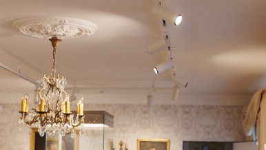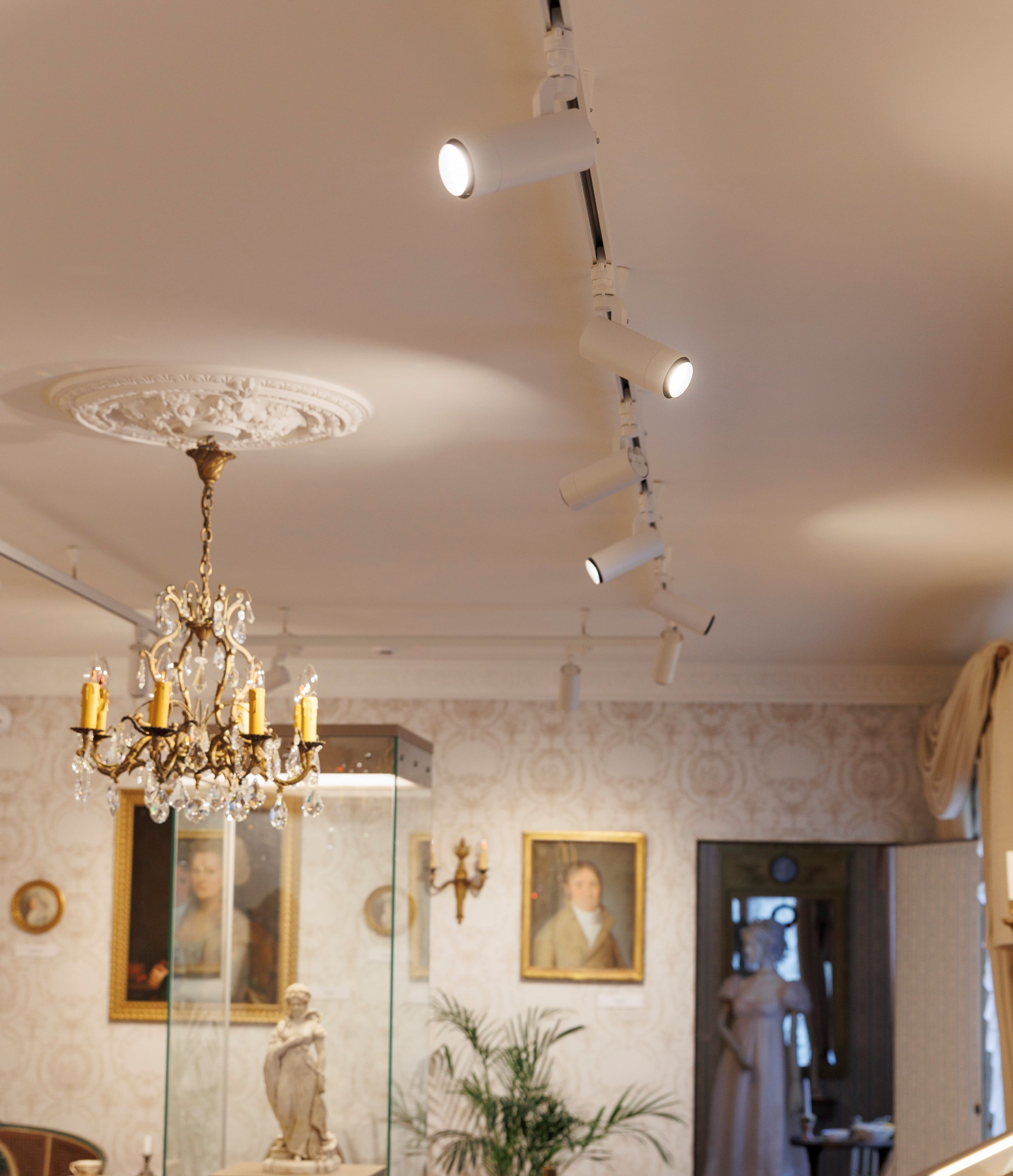 Three-phase track systems allow you to control lighting scenarios in the room easily and quickly. In addition to the fact that the luminaires can be easily moved along the tracks, they can be organized into groups and controlled (on/off) groups separately. The luminaires themselves have an adjustable angle of the light beam (from 20 to 60°) and 350° rotatable housing, which allows you to clearly highlight the accents in the exposition both on the walls and located below.