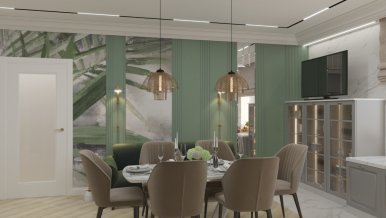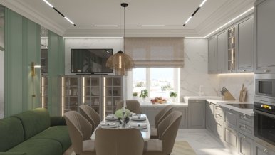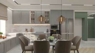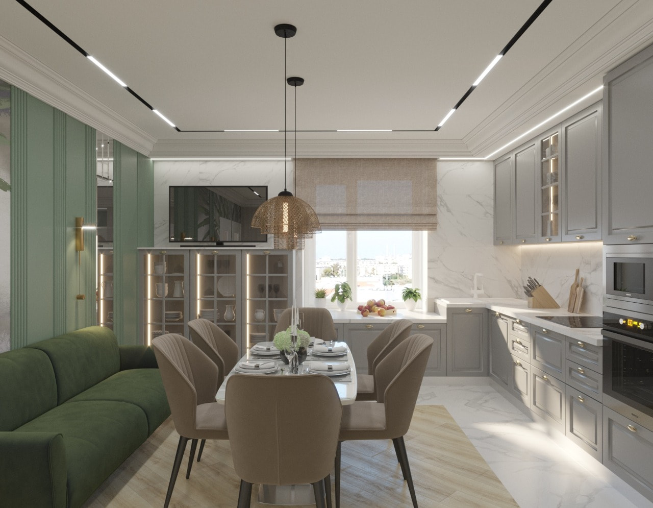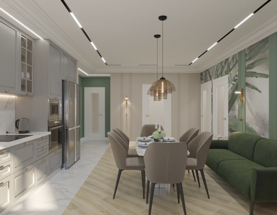 Along the perimeter of the kitchen is a graceful line of illumination, which outlines the ceiling, creating an additional volume, visually increasing the height of the room.