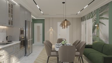 The tracks repeat the rectangular geometry that the space is filled with - moldings on the ceiling, filings on the facades of the kitchen, transparent inserts on the doors.
