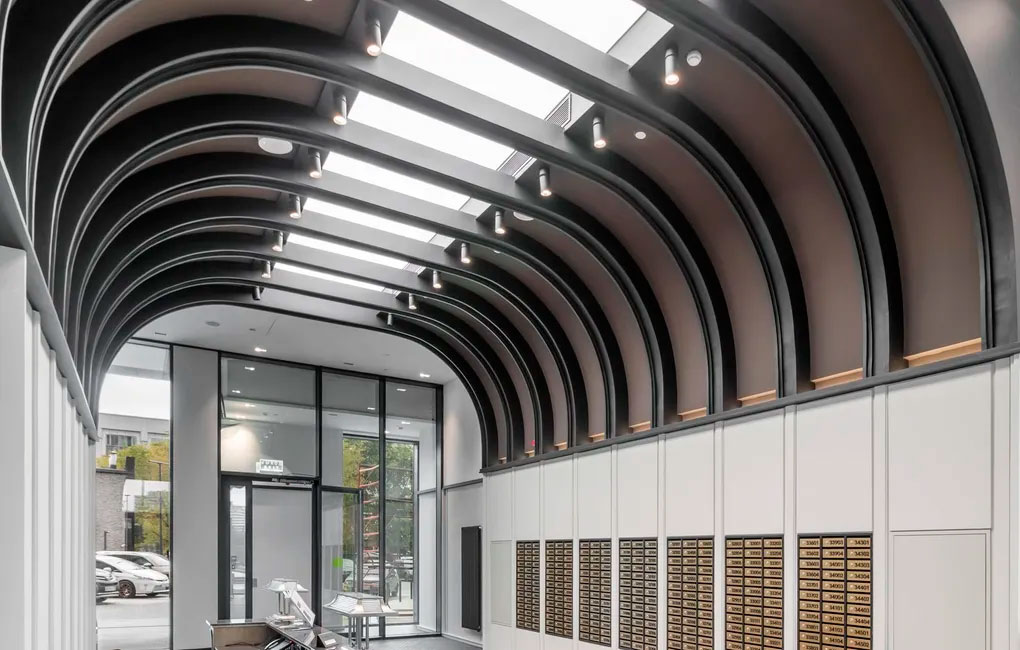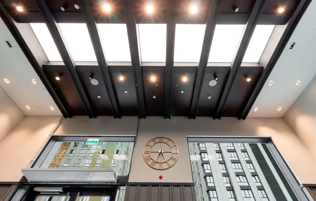 The facades of the building are decorated with materials characteristic of the Big Apple: stone in different textures and glass. The lobby of the complex is decorated in the style of New York Central Station: muted color scheme, arched vaults, large clock with a round dial and Roman numerals.