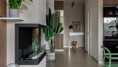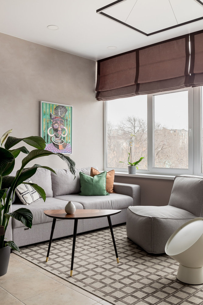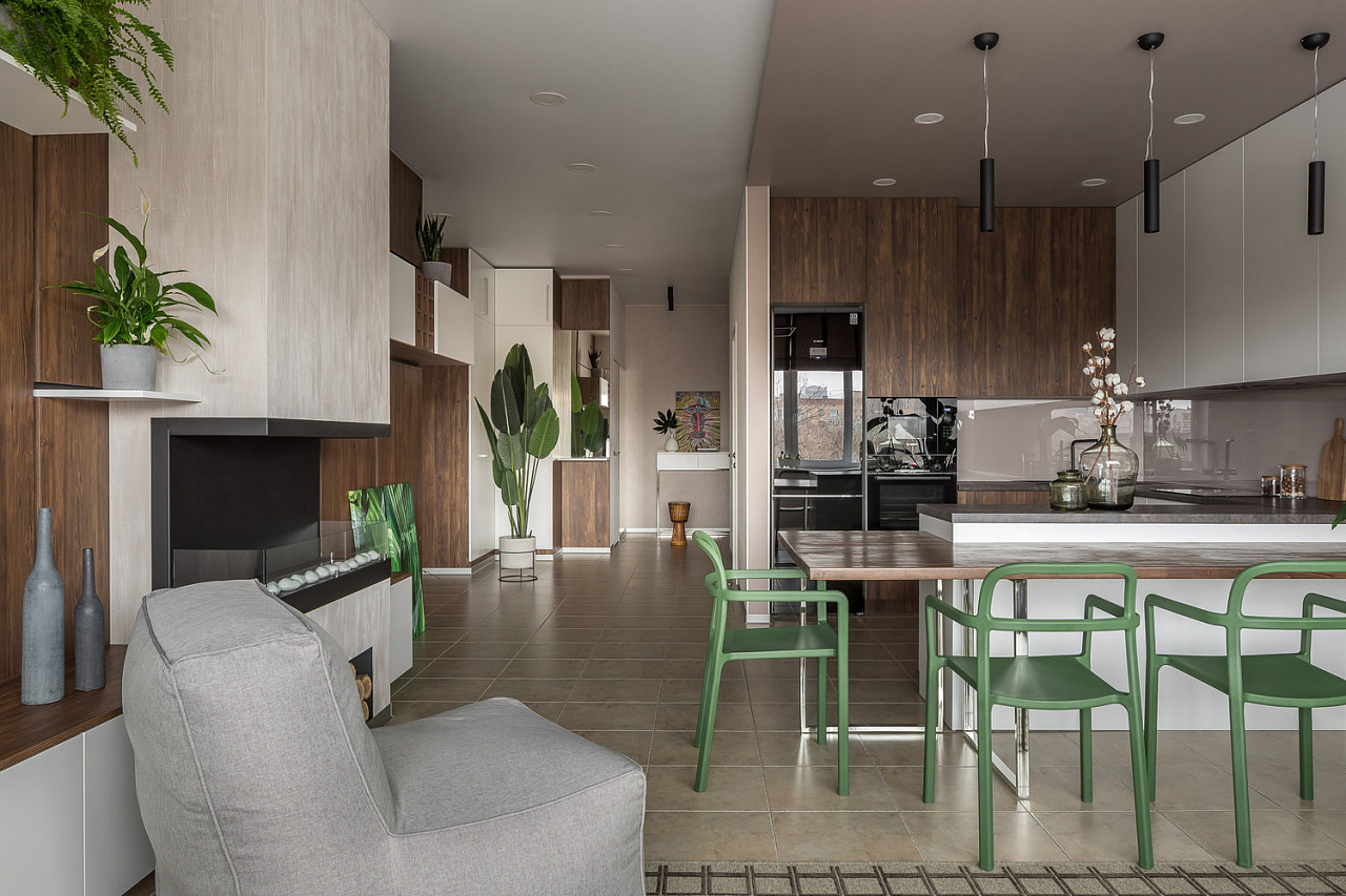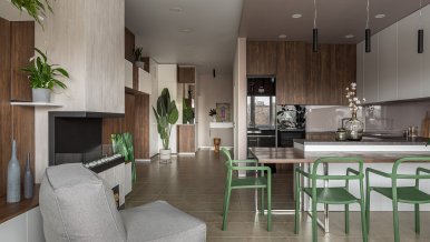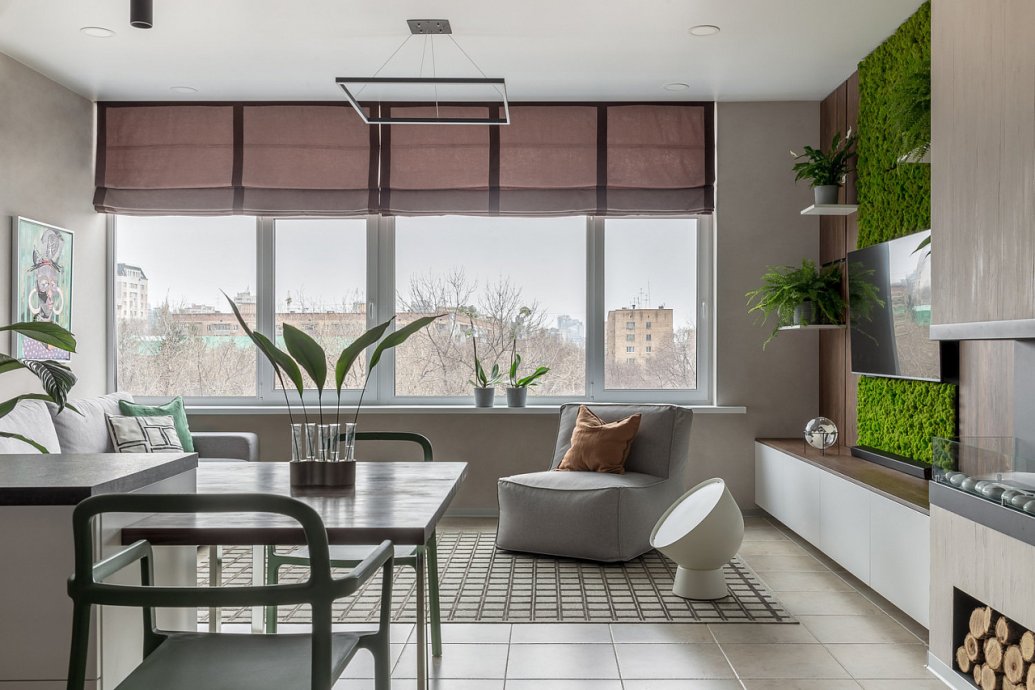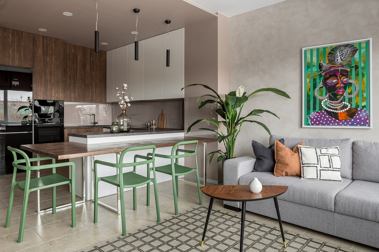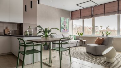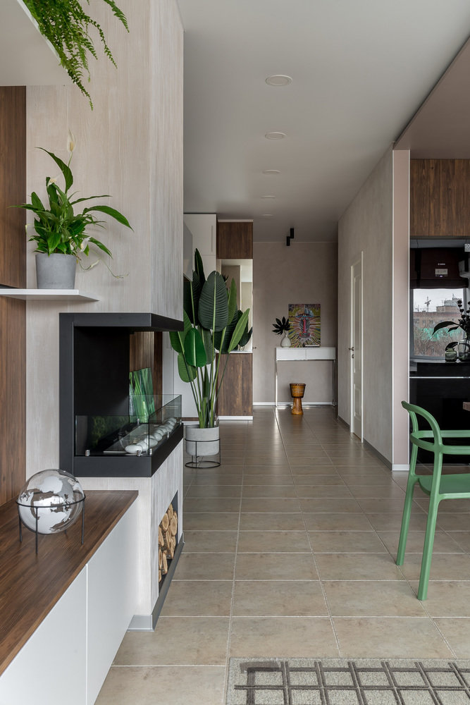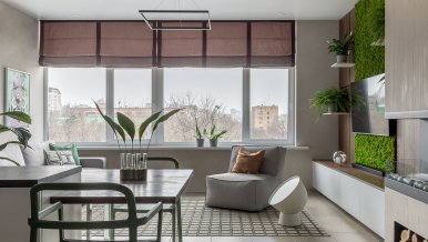 The space of the studio apartment is filled with lightness, light and air. Calm natural shades, lots of greenery and natural light. Artificial lighting does not play a major role in the project. In addition to a pair of laconic pendant lights, the main lighting is provided by built-in flat LED panels, which almost merge with the white ceiling, and above the kitchen area harmonize with the facades of furniture.