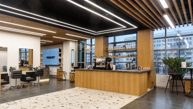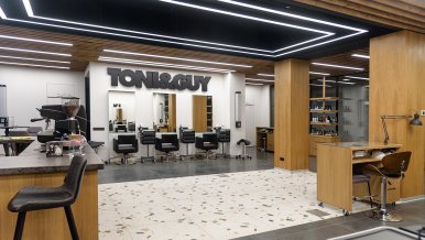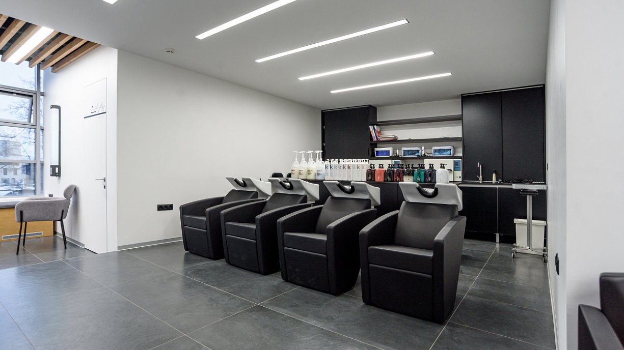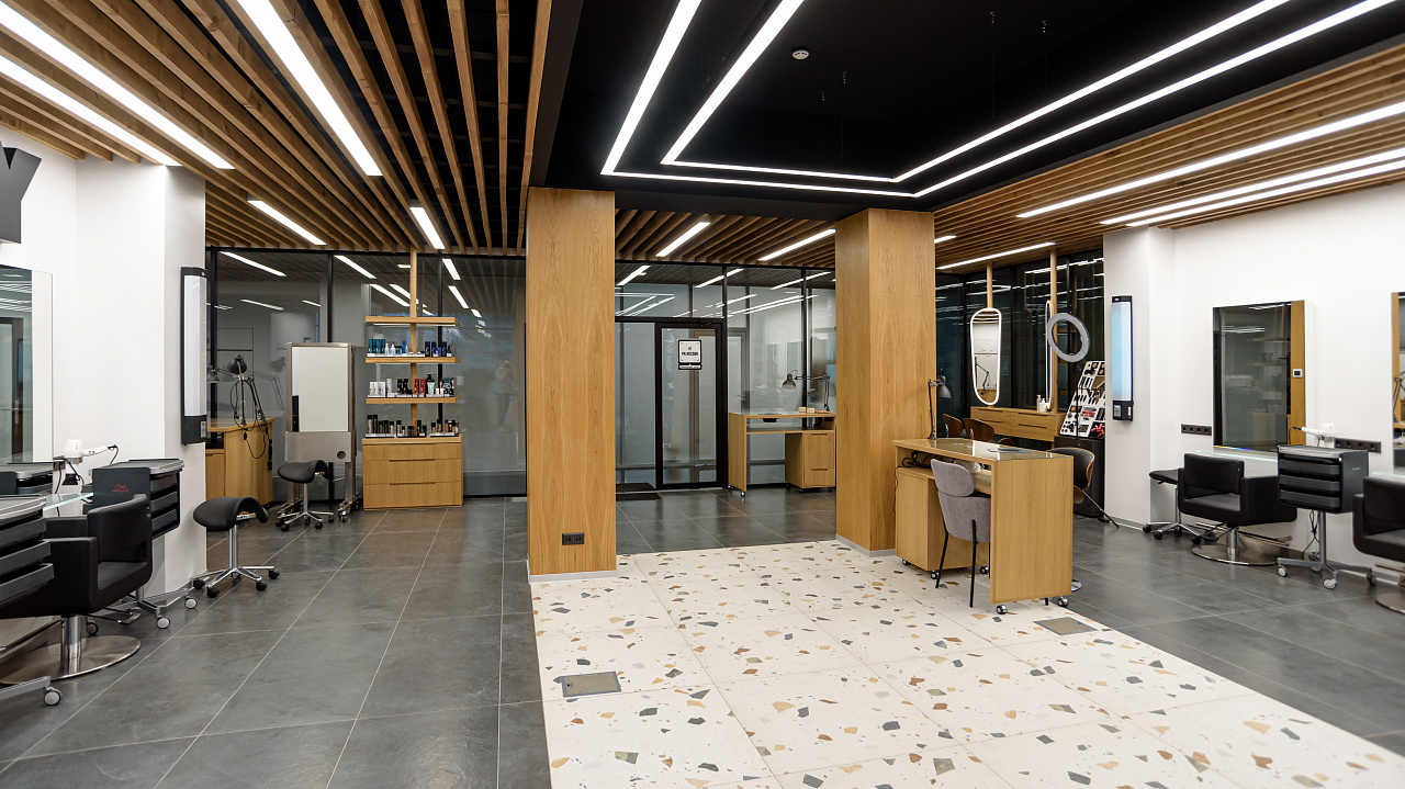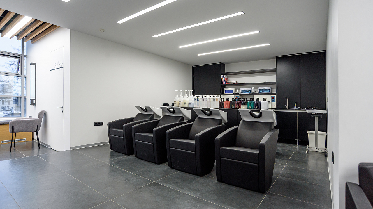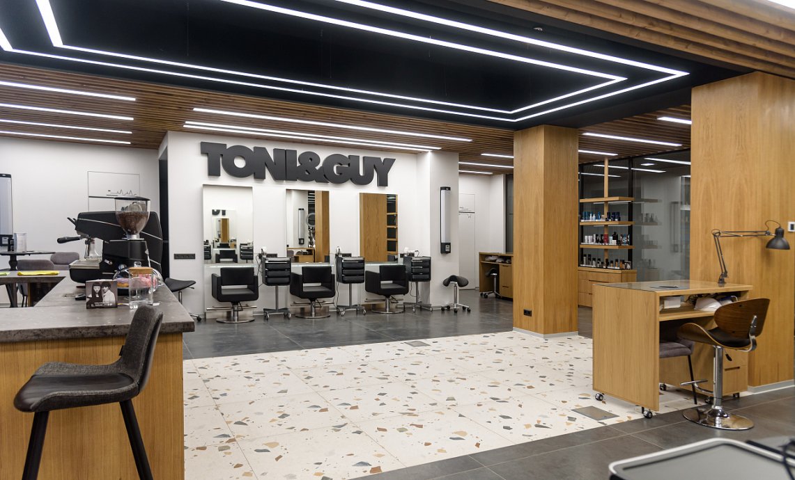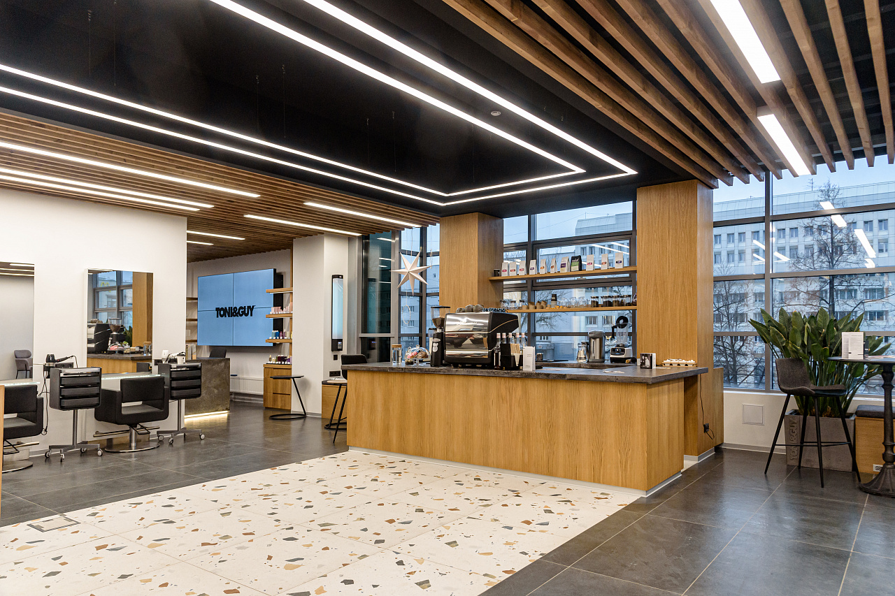 In the Toni&Guy beauty salon, the designers gave lighting a special role. In the main hall, light lines of various widths are installed both in the glossy black ceiling and in rows of wooden slats. Geometric light pattern stands out brightly against the background of the dark interior, reflected in the gloss and creates interesting visual effects.