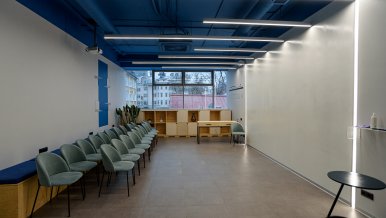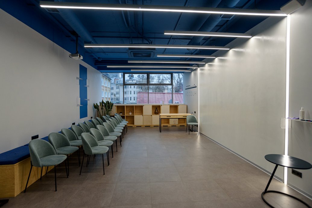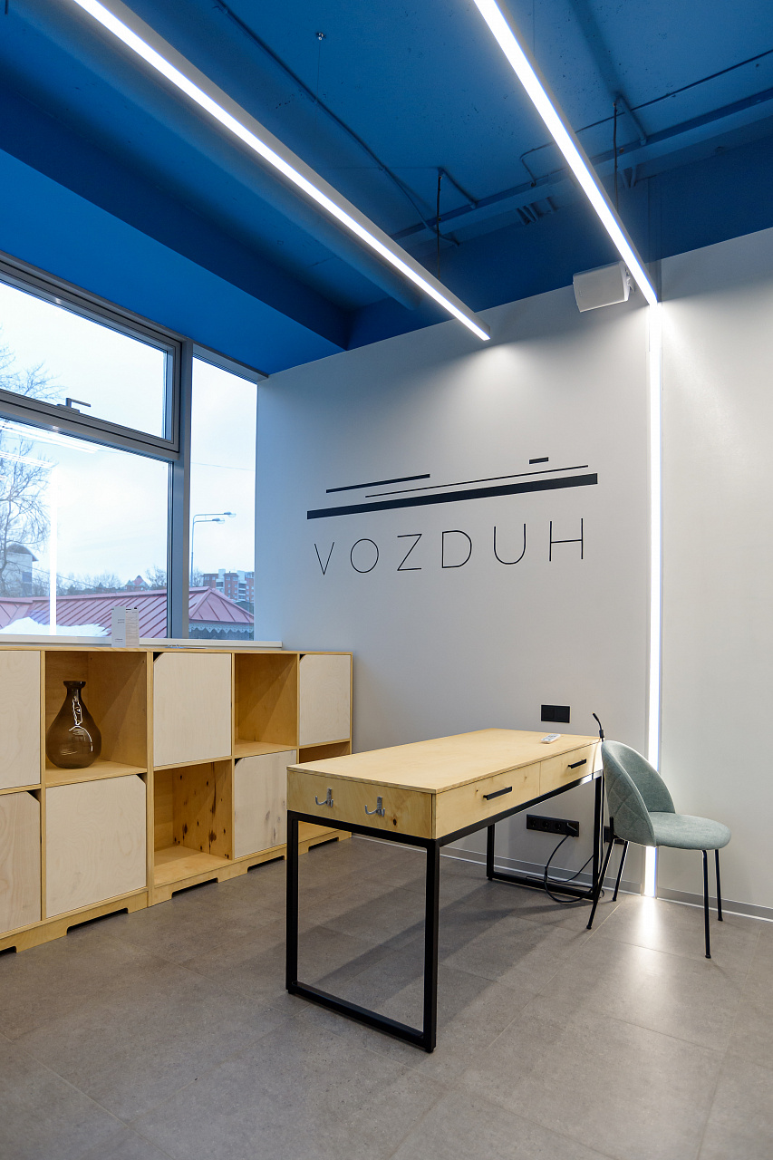 To illuminate other areas of the salon are used ring-shaped luminaires with internal light, suspended linear luminaires, round surface-mounted luminaires - in accordance with the interior features and purpose of the area.