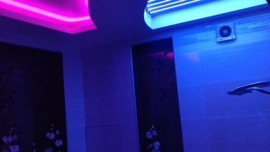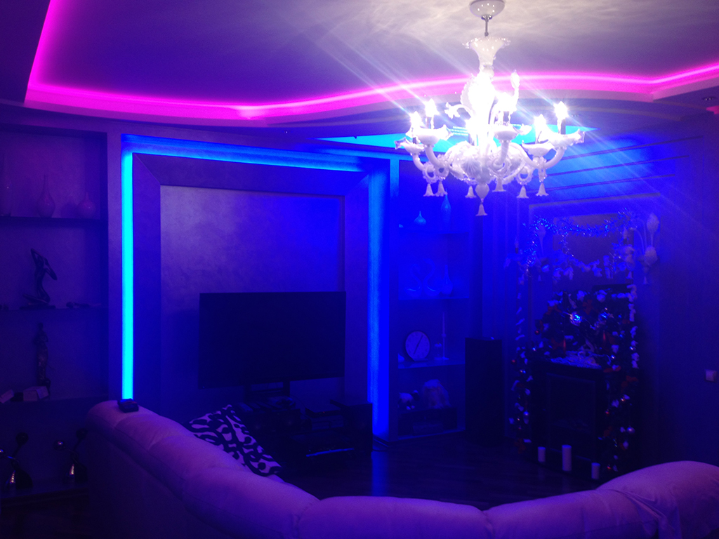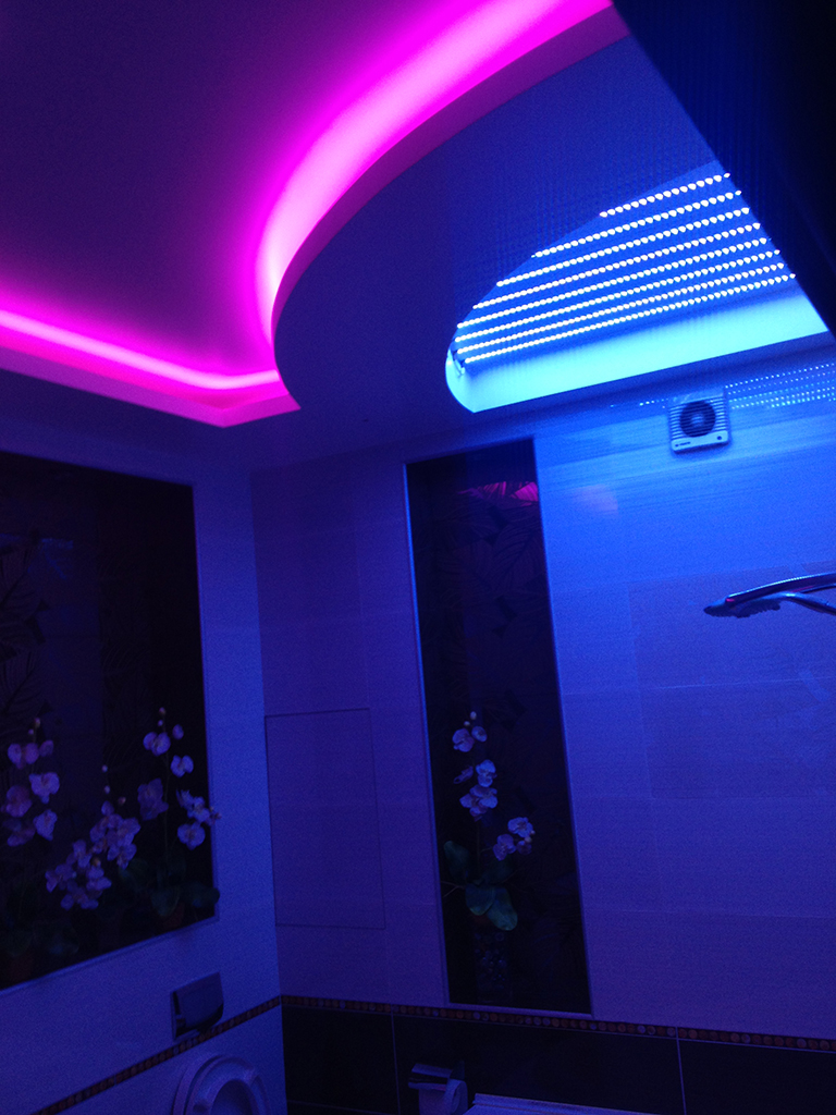 RGB LED strip from Arlight was used for decorative lighting in the apartment. The tape with a density of LEDs was installed in ceiling and wall niches. All three-dimensional decorative forms were decorated with light with the ability to choose any shade of glow.