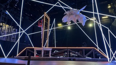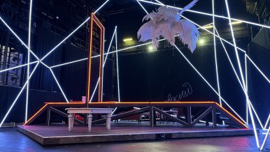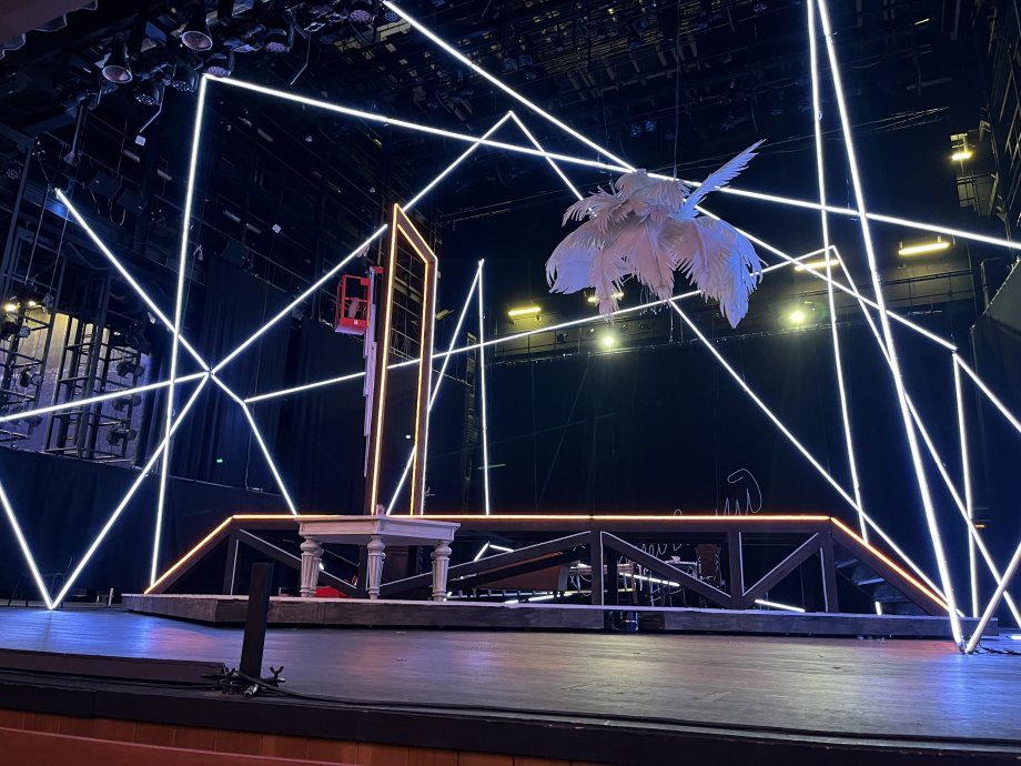 It is an installation resembling intertwined threads of a spider's web, covering the main place of action like a dome. The platform itself is also outlined with a light contour, which makes it stand out against the dark background. To implement the idea of the main artist of the theater ideally suited Arlight equipment: flexible round profile WPH FLEX and multicolor RGB-tape, controlled by SPI protocol.