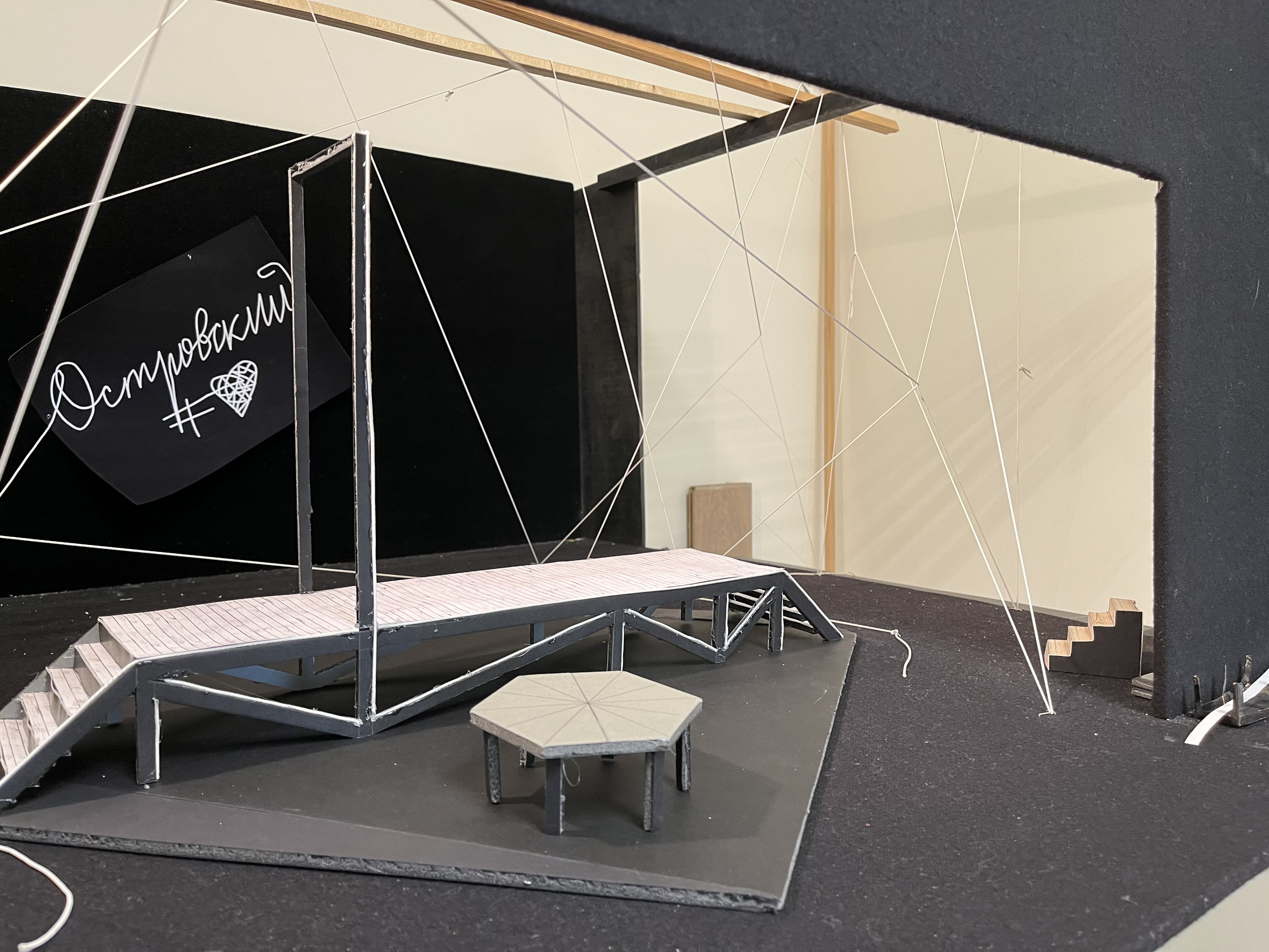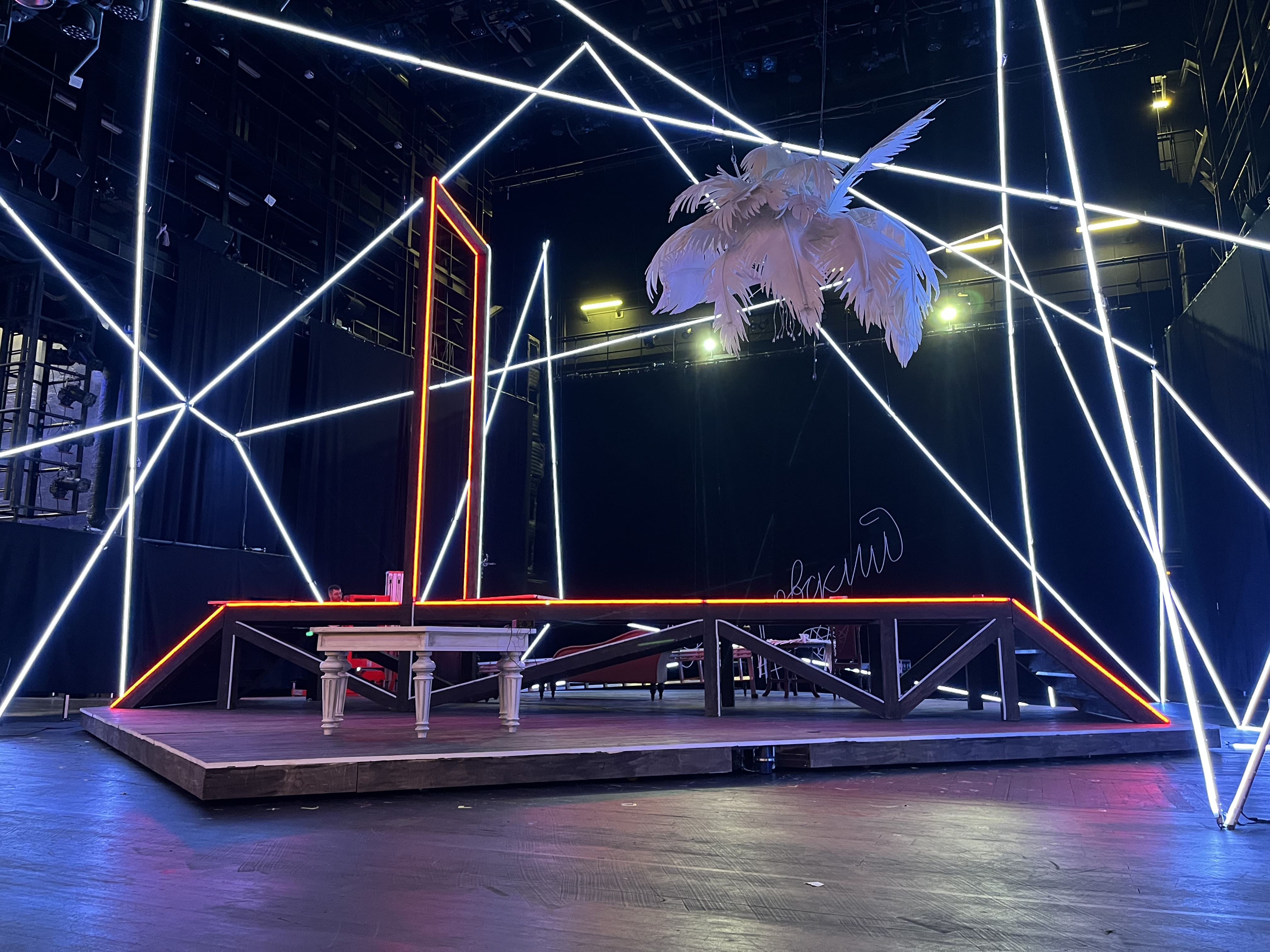 Another feature that became possible thanks to the flexible profile and SPI-controlled tape was the light inscription repeating the name of the play “Ostrovsky #love”. The inscription is made with the imitation of handwritten font. Light carelessness, liveliness and sincerity of the font was achieved by the ability to bend the profile in space, and SPI-protocol allowed to create the effect of appearance of the text displayed before the eyes of the audience.