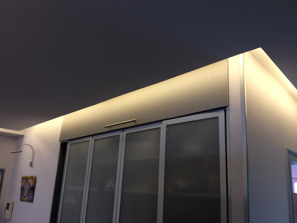 After a while, LED lighting has confidently seized the market, and the owners of the apartment decided to update the lighting, improve its quality and reduce energy consumption. Previously, for backlighting used lamps T8, whose obvious disadvantages were noticeable to the eye flicker, as well as intermittent line of light. The original lighting was dismantled, and its place was taken by Arlight LED strip white color luminescence.