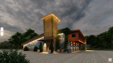 The facade of the restaurant is illuminated with a cozy warm white glow, creating an atmosphere of festive hospitality. Lightness and airiness of the restaurant building, stylized as a medieval tavern, are given by LED garlands “Fringe” and “Thread”.
