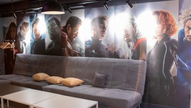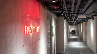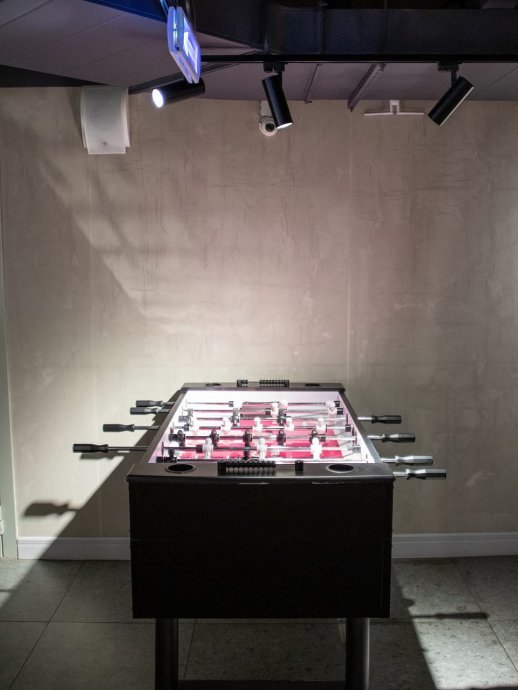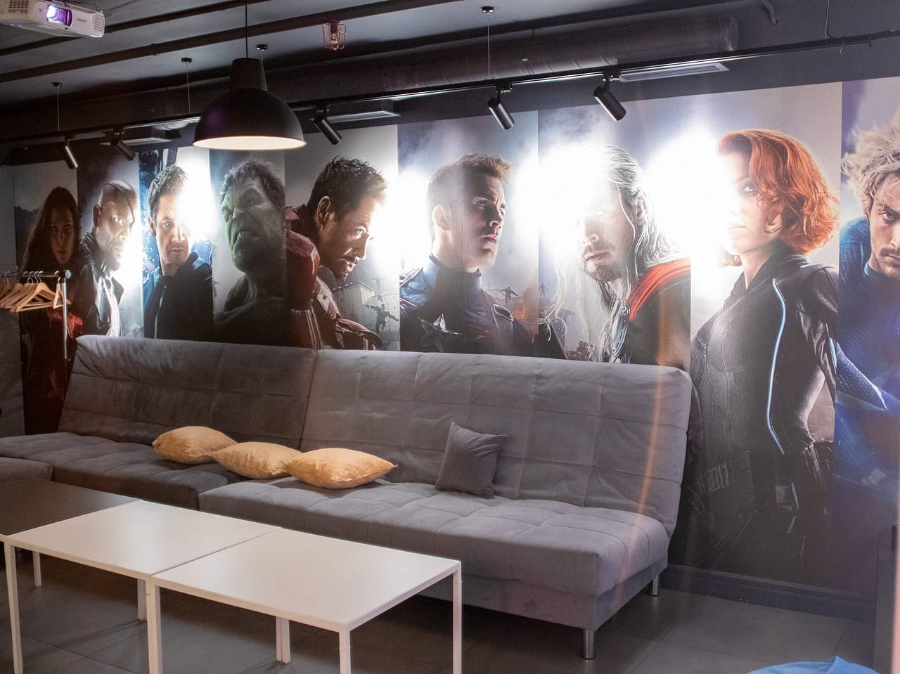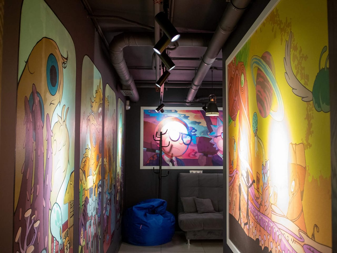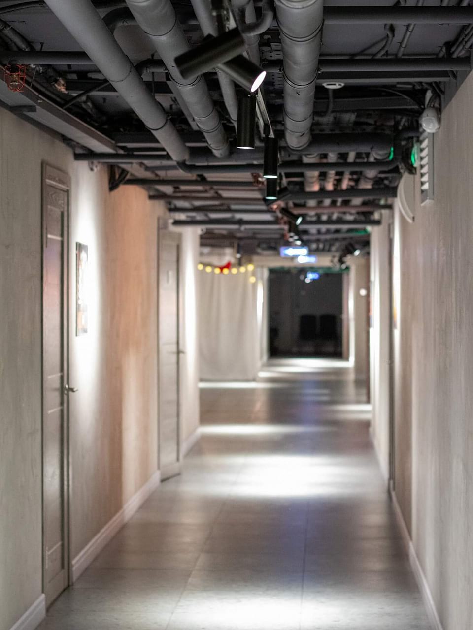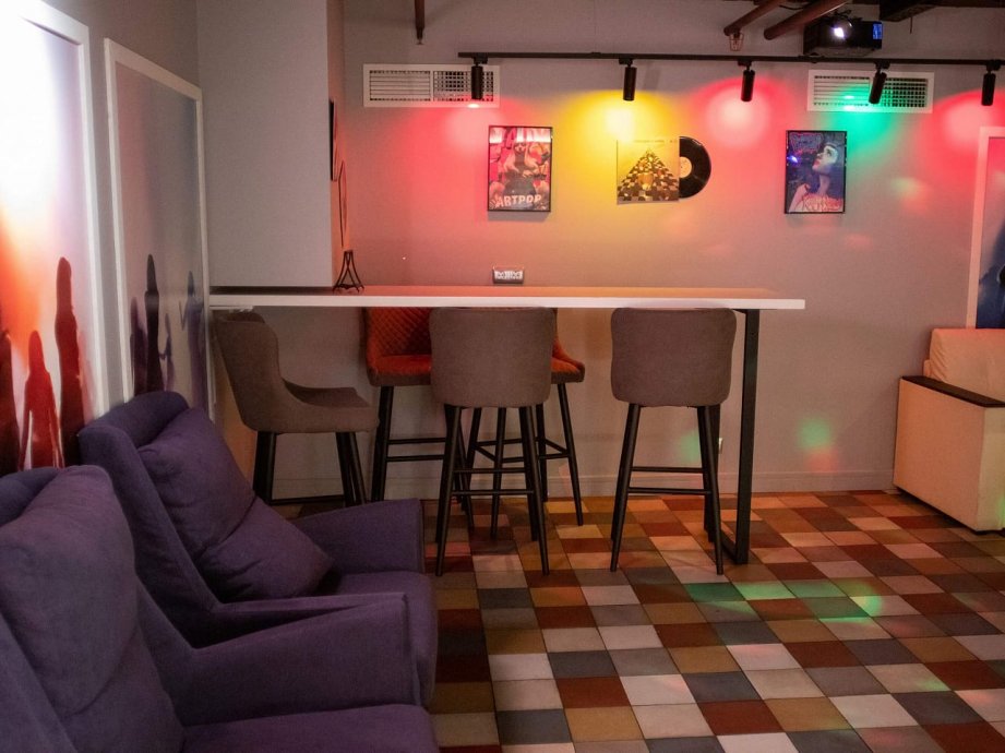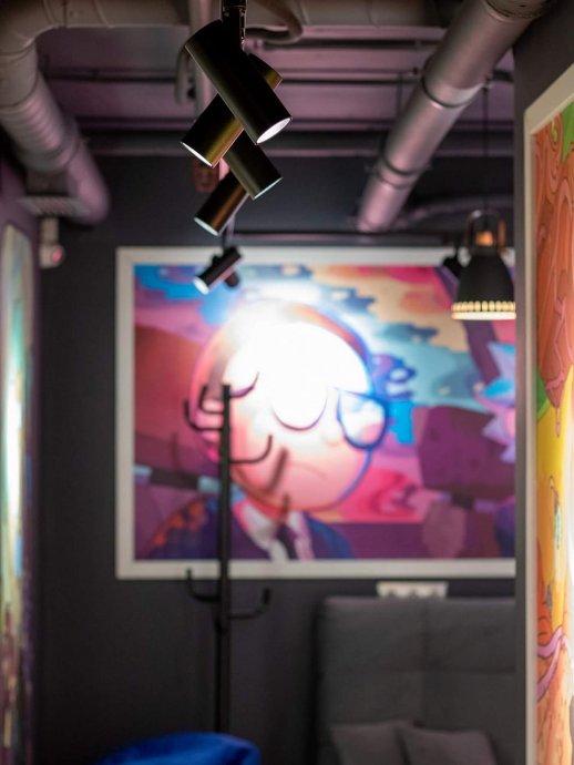 A popular solution - track lighting fixtures - was used to illuminate the creative space Party time, designed in loft style with bright accents. Black tracks practically merge with the ceiling without attracting unnecessary attention. Their task is to give high-quality accent light and complement the interior, not to single lead. High-quality light space is provided by high color rendering index of GERA luminaires. This is important, as the luminaires in many locations are used to illuminate colored art objects.