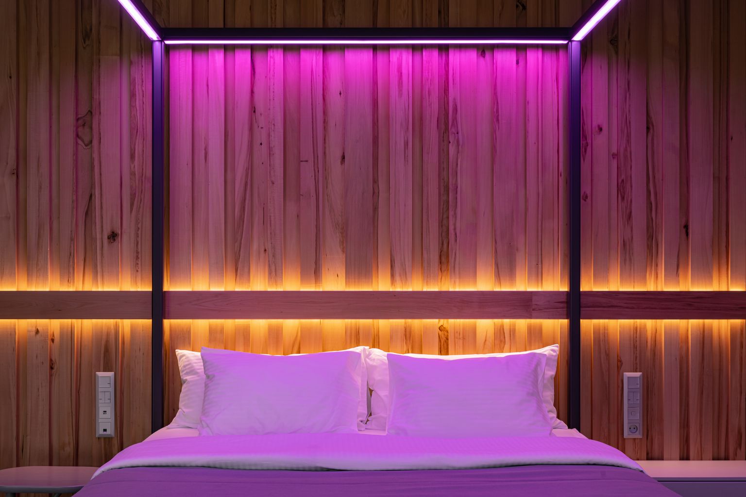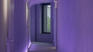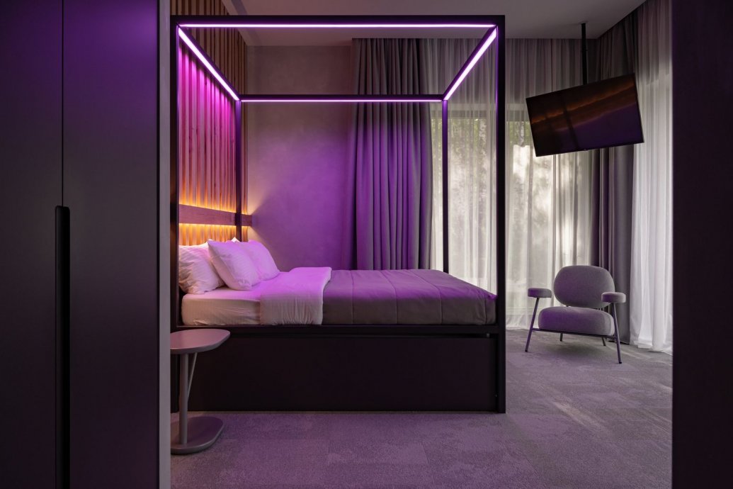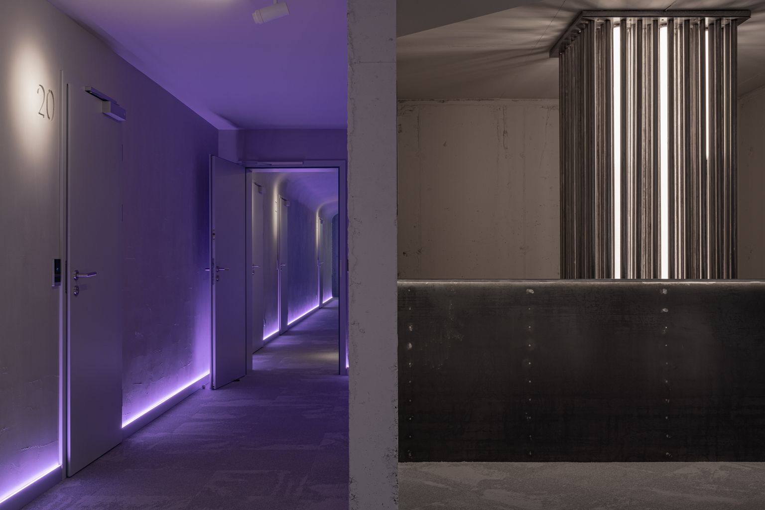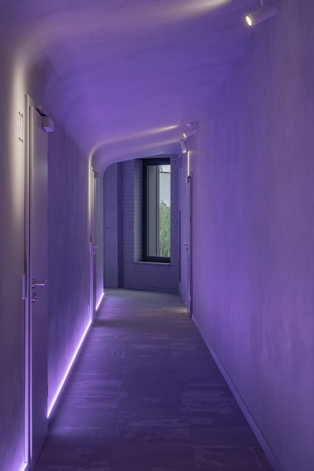 Corridors are filled with intense violet light, which immerses into an unreal world. For easy navigation, guest rooms are illuminated with ZEUS track lights for accent lighting.