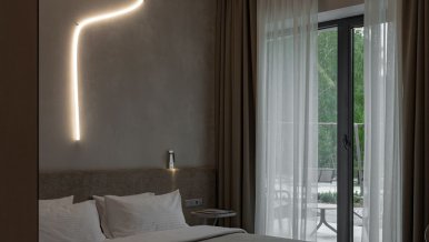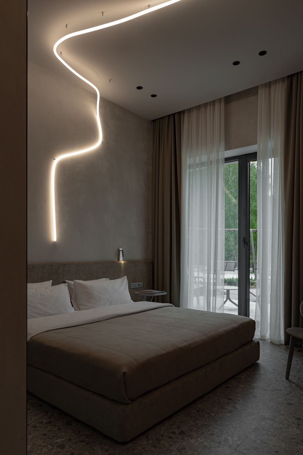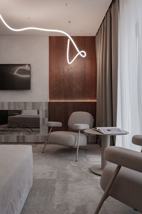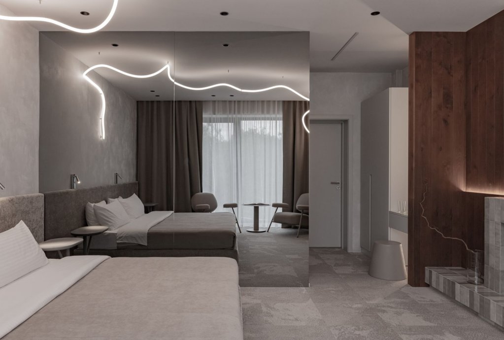 Each hotel room is dedicated to one of the seven water elements. The interior of each room is themed accordingly. In some rooms, it is the lighting that plays a key role in creating the atmosphere. Guests can choose a calm design in the rooms “Fog”, “Snow”, “Stil” or more extravagant. For example, the rooms “Typhoon” are decorated with RGB LED tape in a bold purple-orange color scheme, creating a sense of impending storm at the end of the day. And in the rooms “Thunderstorm” illusion of sparkling lightning creates a flexible neon, stretched across the entire space.