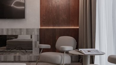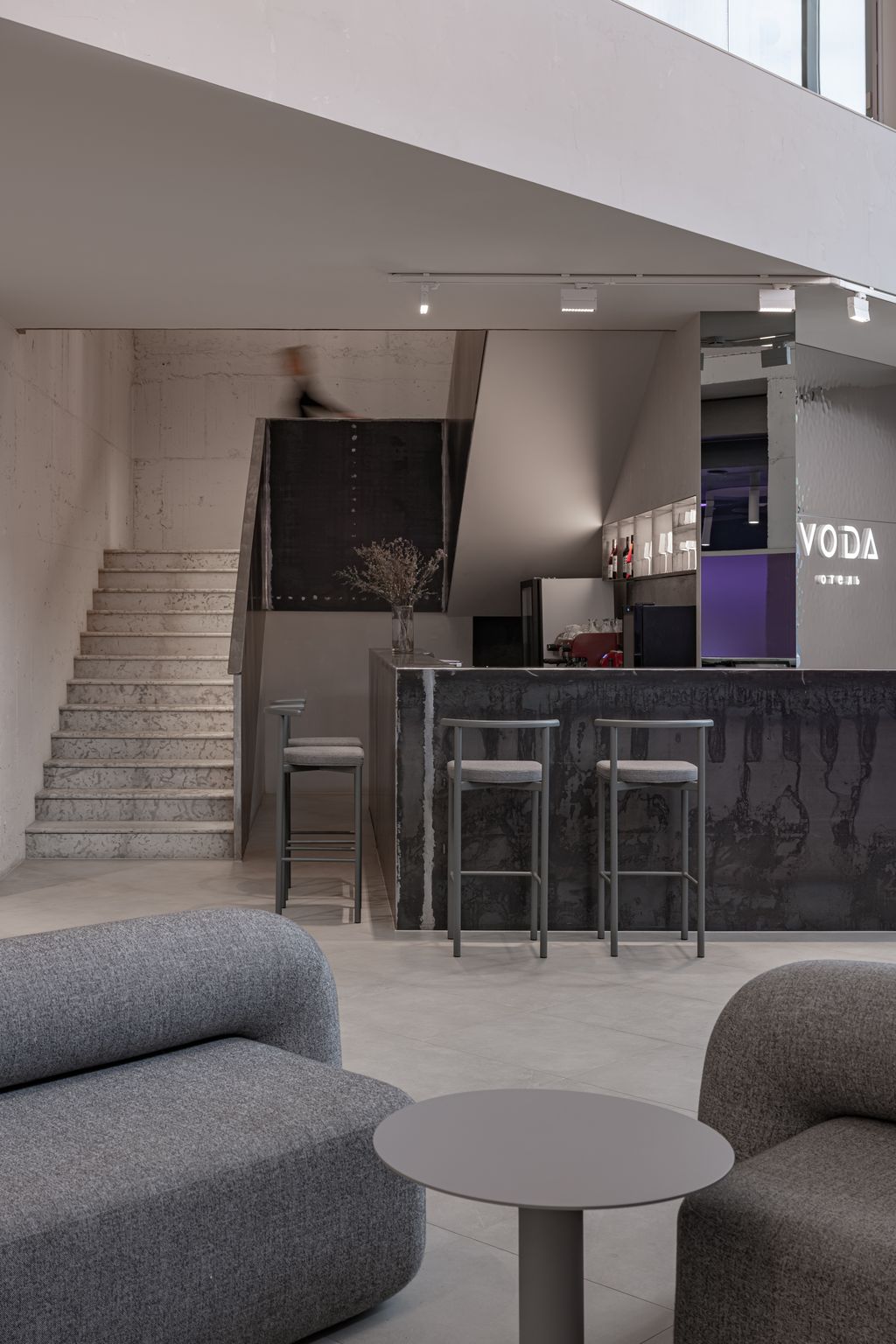 On the territory of the thermal complex with the same name there is a cozy boutique hotel VODA. The architectural solution of the building is gently integrated into the surrounding natural space. The dark gray horizontal masonry facade paired with vertical panels looks neat and restrained, allowing nature to remain in the foreground. The reflection of the trees in the large panoramic windows creates an illusion of interconnection between the interior and exterior spaces.