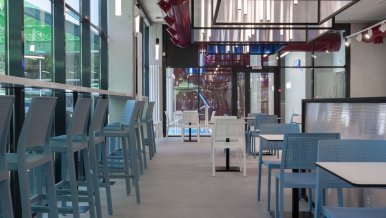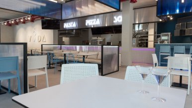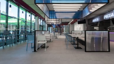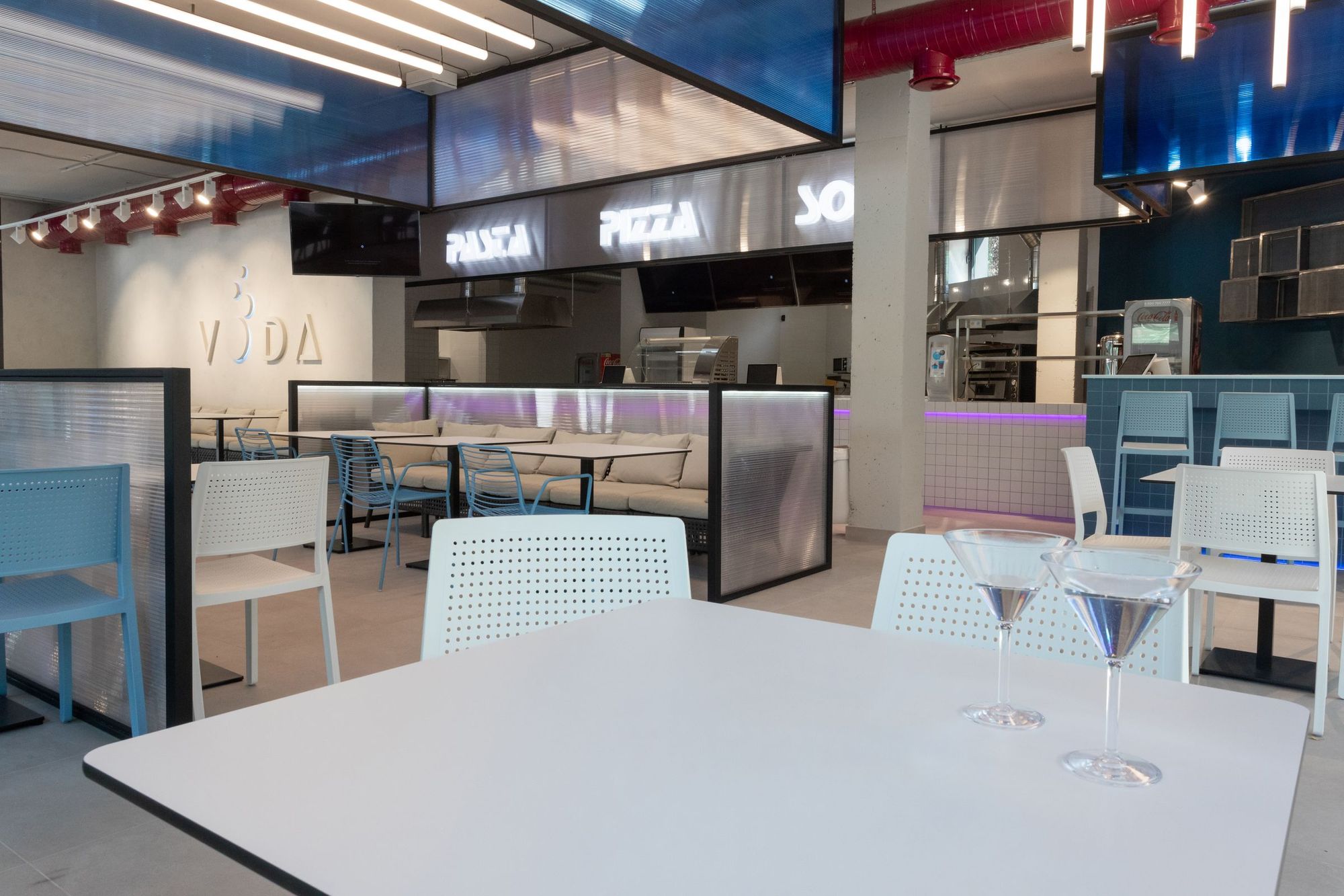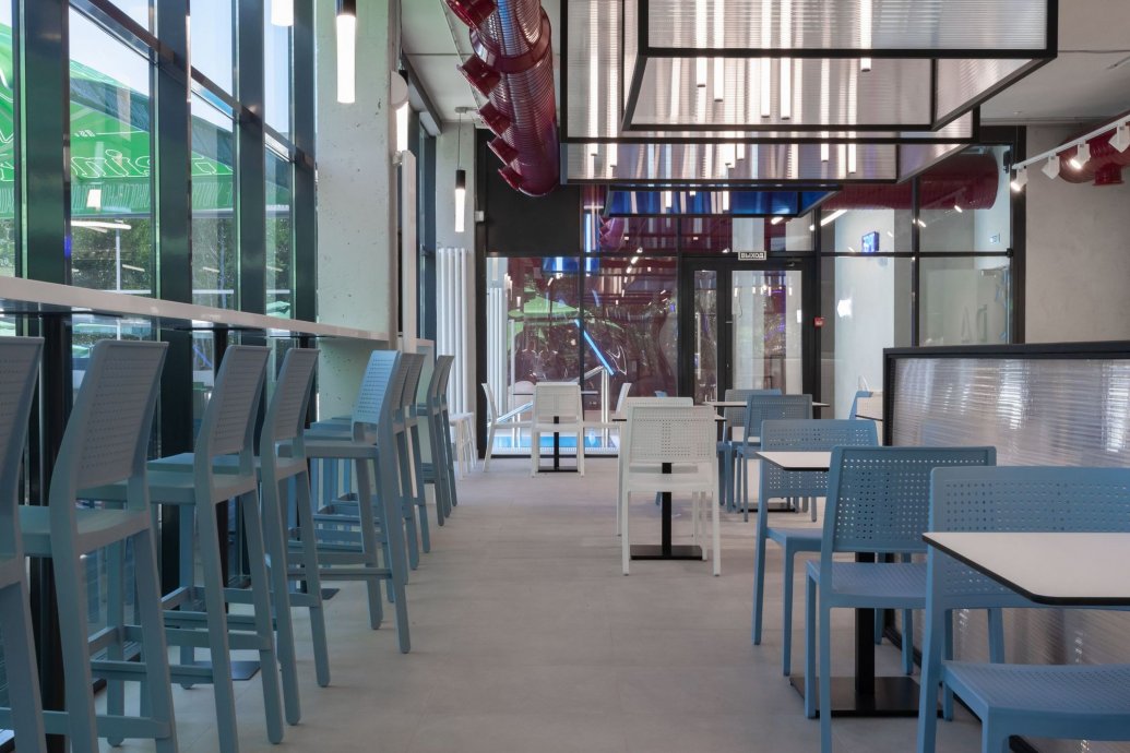For the main lighting in the corridors of the thermae and cafe, linear luminaires based on profile and LED strip were used. In the cafe area, local lighting is organized with the help of original tube luminaires with vertical orientation. To create them used round profile and LED strip with the highest color rendering index (CRI>95). In such a light space, the colors look especially pure and bright, which is in line with the overall concept.