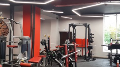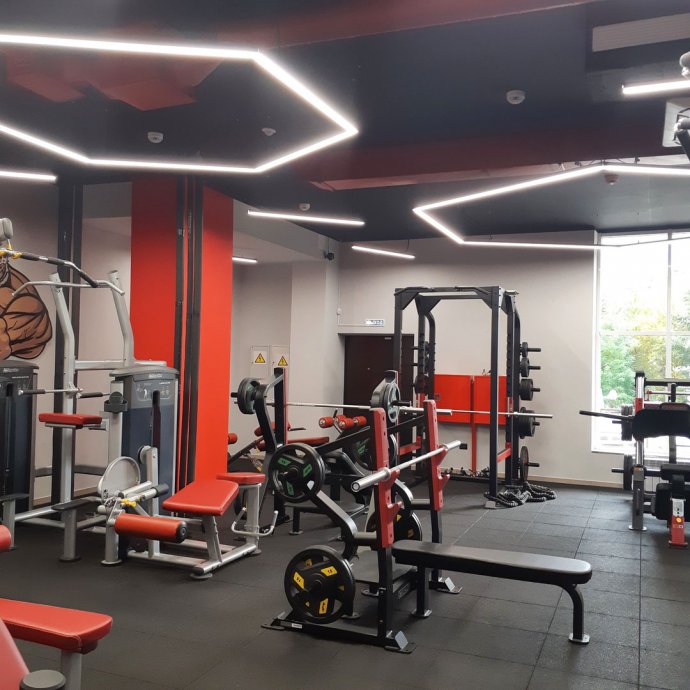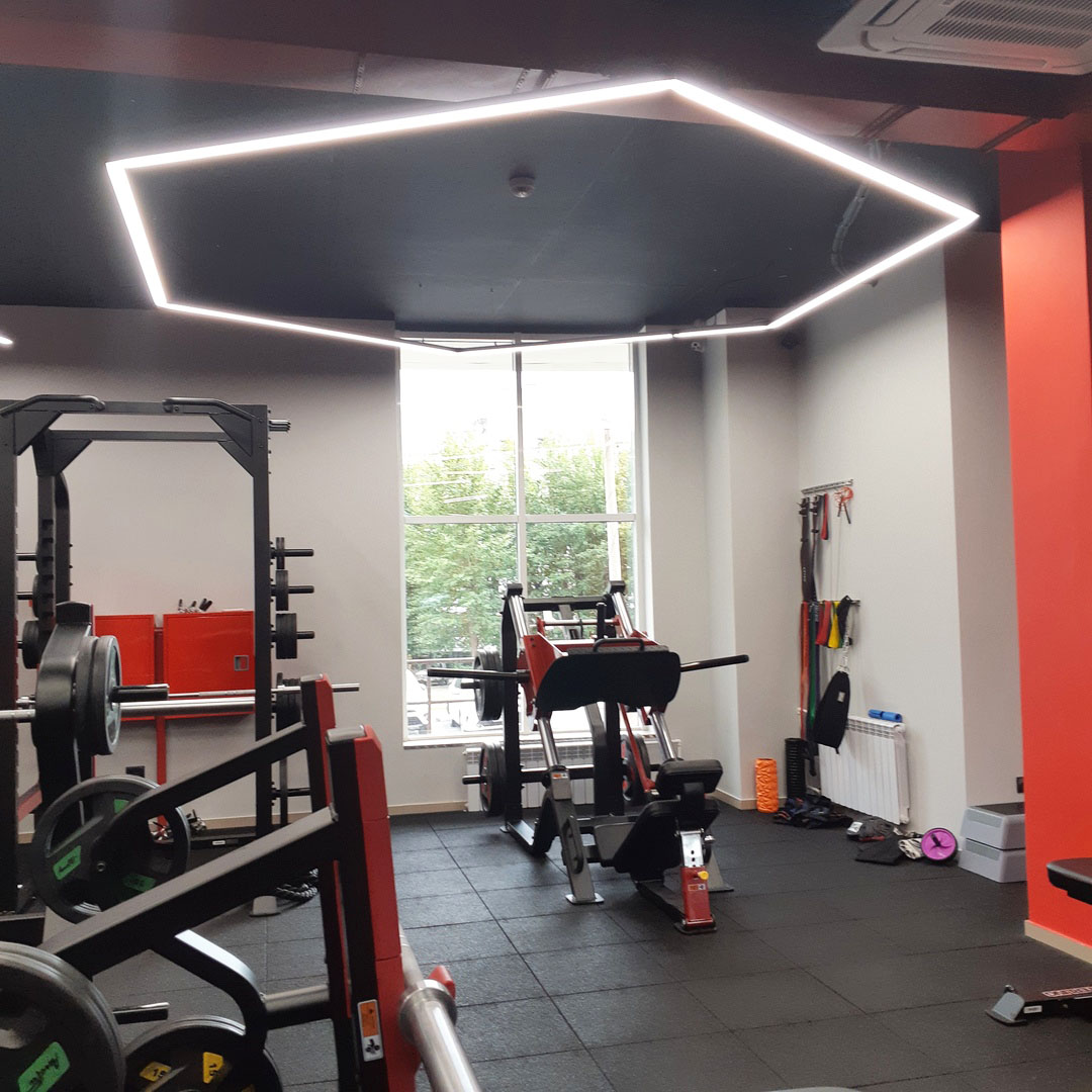 Profile luminaires are used as the main lighting sources in the gym. Interesting geometric shapes give the room boldness and set the mood for active training. The highest color rendering index (CRI>95) of the tape mounted in the luminaires creates a comfortable light space and promotes high performance. At the same time the matte screen softly disperses light, avoids the effect of blinding.