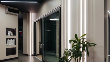 Light lines based on MICROLED and RT-A120 series LED strips and profiles with screens are clearly and harmoniously integrated into the interior. Suspended linear luminaires on the ceiling serve as the main source of illumination and become an integral part of the decorative ceiling composition. Vertical light lines from floor to ceiling emphasize the decorative texture of the walls, visually increase the height of the ceilings and give lightness to the space.