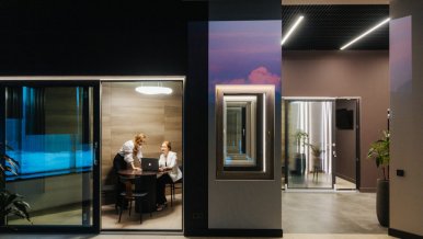 The interior of the window showroom in Izhevsk is based on strict geometry, as if repeating the laconic geometry of the offered products, and is designed to focus visitors on the choice.