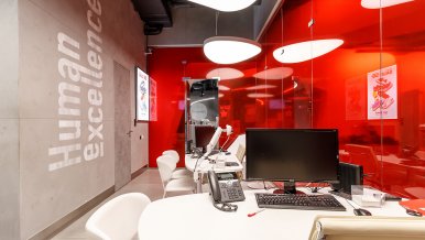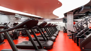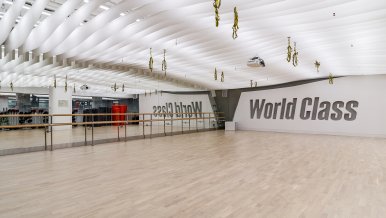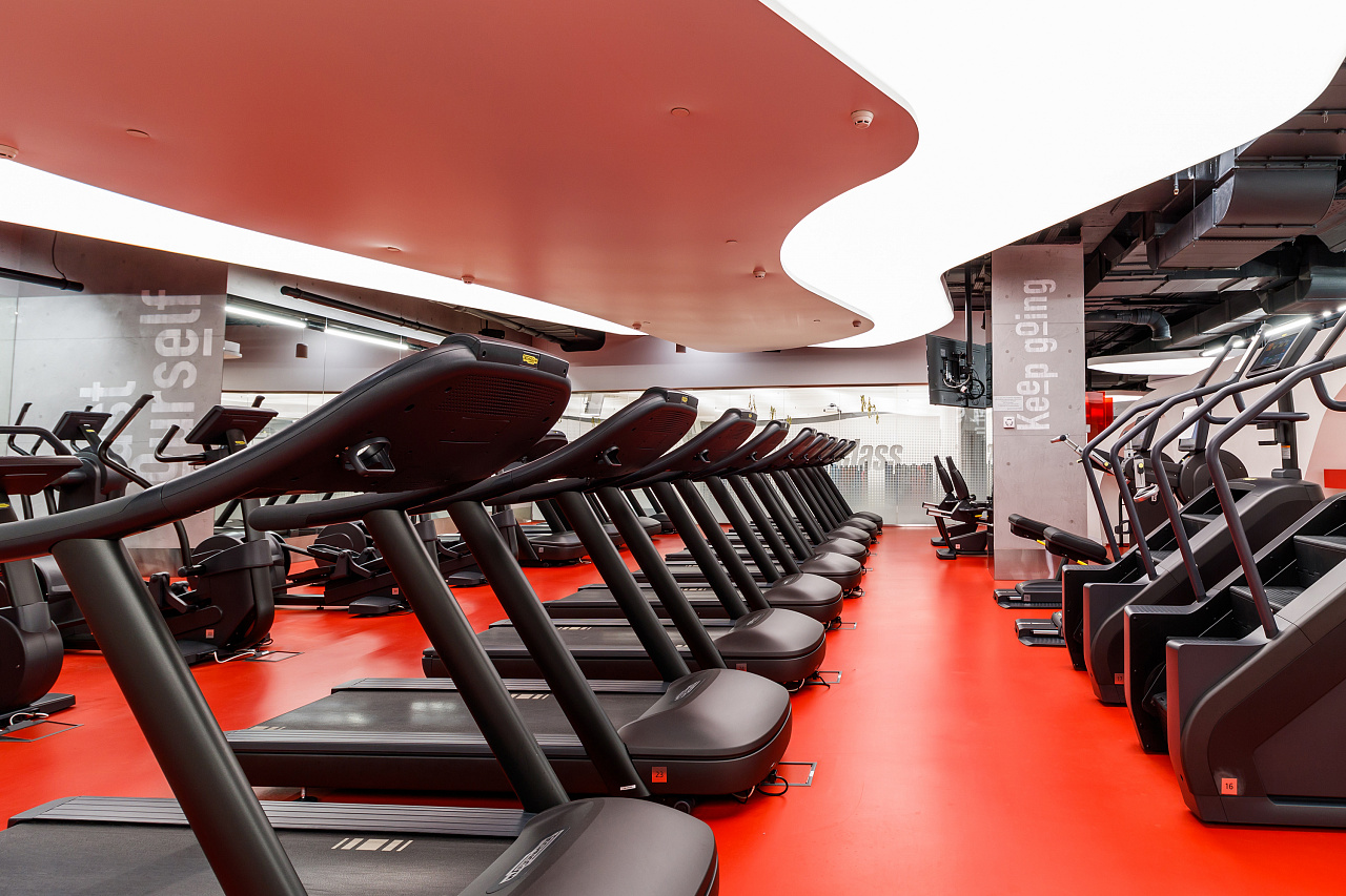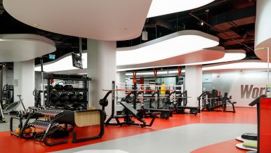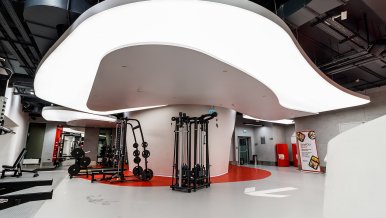 The main “trick” of lighting in World Class fitness clubs is the already recognizable curvilinear luminaires emitting soft uniform white light. The scale of these structures can be different depending on the room. If in the office area they are small neat flat lights, then in the gyms they are large format or even whole luminous canvases that gently wrap around the space and fill it with a pleasant diffused light.