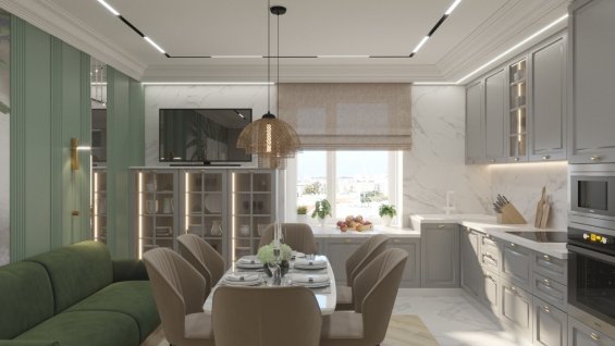 An elite apartment in an apartment building is committed to a monochrome palette, which gives it a cozy and practical space for five family members. The combination of noble shades of gray, white and beige creates an interior that does not tire, even in spacious rooms.