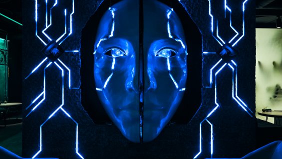 An imposing and mysterious space that mixes unusual lighting and color schemes