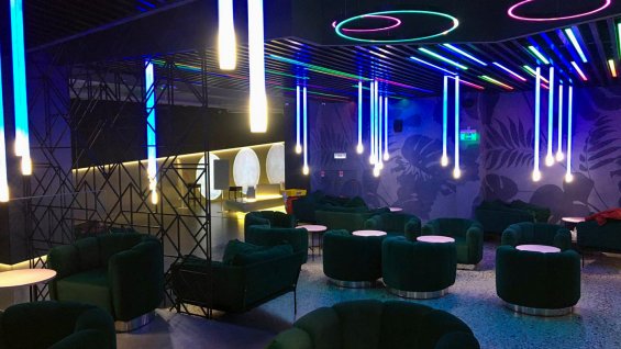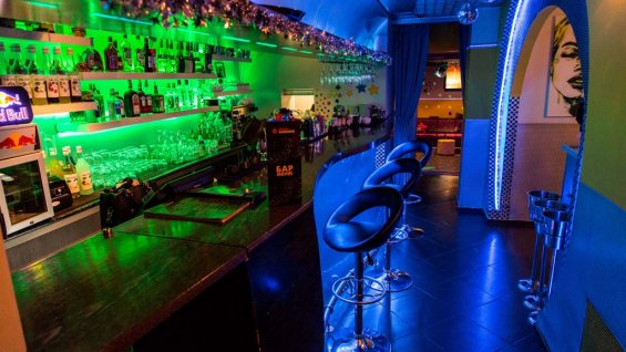 A multitude of bright light lines enliven the semi-darkness of the bar with colorful hues.